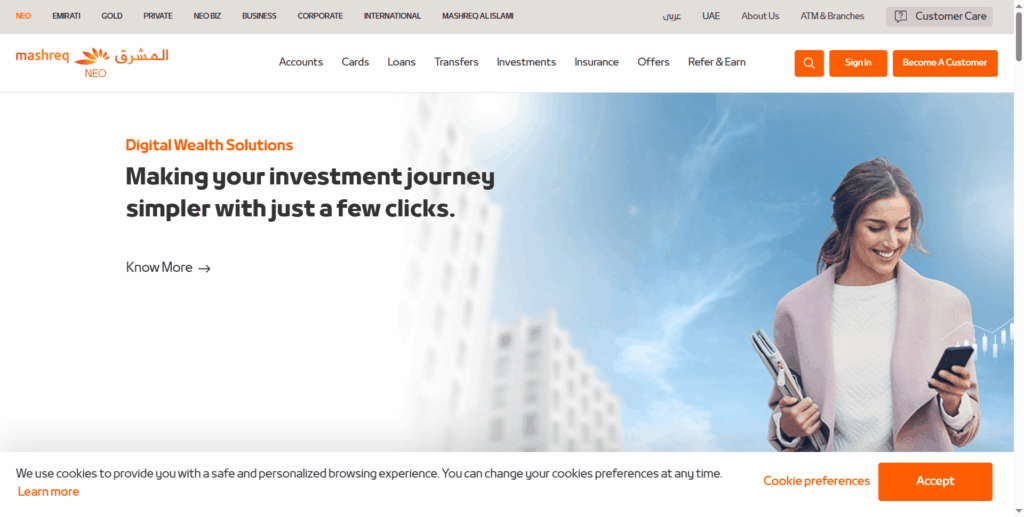 Founded in 1967, Mashreq is one of the oldest banks in the UAE and a leader in digital banking. Its Mashreq Neo platform is fully app-based, perfect for tech-savvy users seeking a modern banking experience.